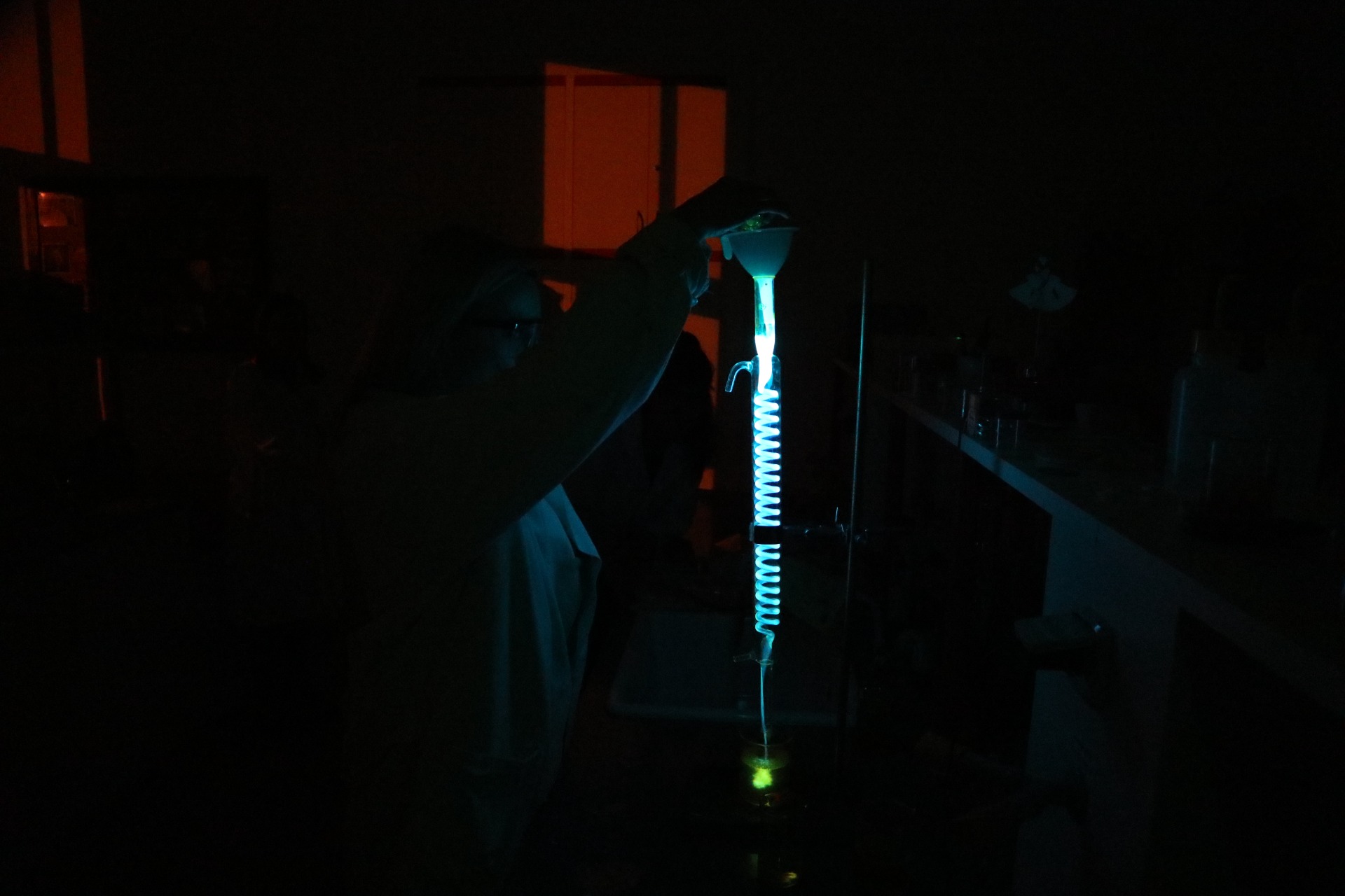 Kdybyste se leckterého chemika zeptali, s jakou nejcennější látkou v laboratoři pracoval, odpověď by možná zněla: "Luminol". A v prosinci došla řada i na nás.. Po krátkém teoretickém vysvětlení jevu chemoluminiscence jsme se odebrali do laborky a namíchali roztoky A a B ve dvou různých provedeních. Pak jsme zhasli a zkoušeli: průtok chladičem, přikapávání v Petriho misce, přidání trochy fluoresceinu – fungovalo vše.. Potom jsme se vrátili do učebny a další část setkání trávili povídáním, pohoštěním, příjemným relaxováním – vždyť na druhý den začínaly prázdniny..