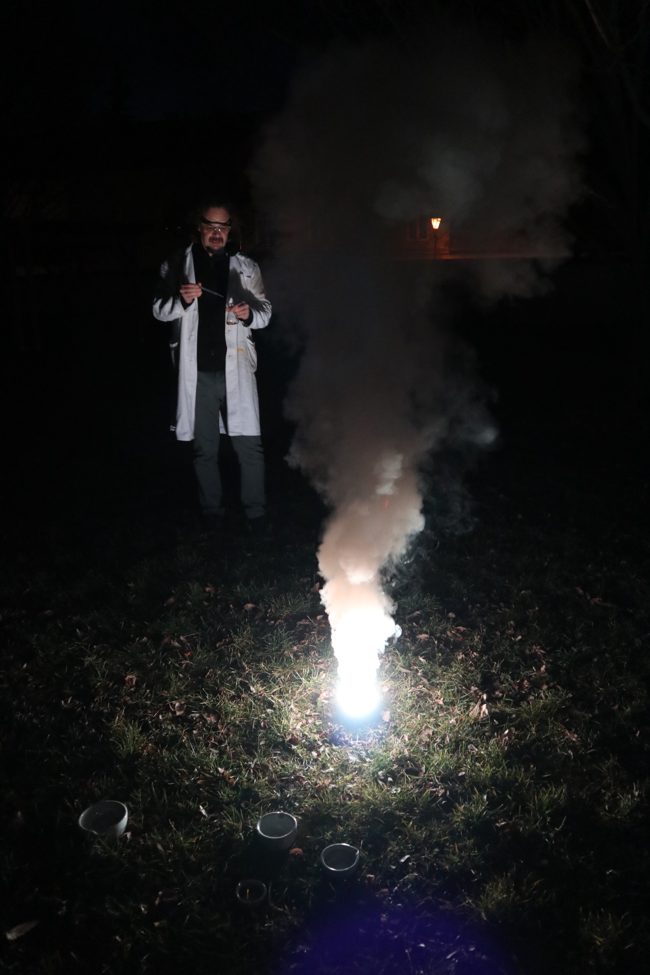 A bylo to dobré rozhodnutí: barevné plameny po západu slunce nádherně vynikly a poslední zbytky modré na západní obloze tomu všemu daly romantický (postapokalyptický) nádech.. Efektnímu střílení plamenů pomocí rozstřikovače předcházela instrukce, jak to zrealizovat tak, aby vám nezačaly hořet prsty a jak zbytečně nepanikařit, když hořet začnou, a já si vzpomněl, že když jsme tento experiment nedávno zkoušeli s maturanty, jedna studentka se zeptala, jak vše provést tak, aby jí prsty hořet začaly: fire walk with me..